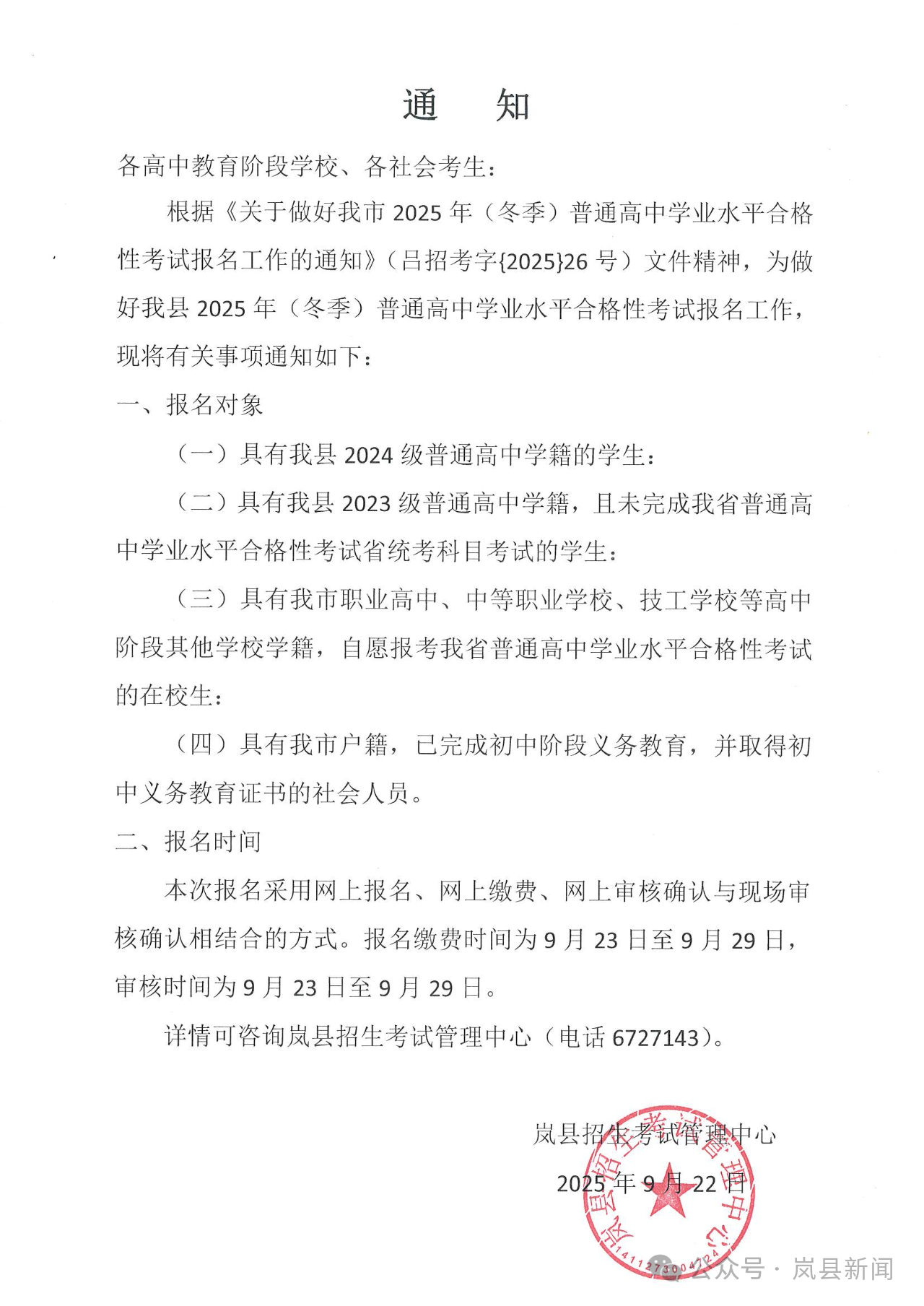 • 【通知】我縣2025年(冬季)普通高中學業水平合格性考試報名工作通知